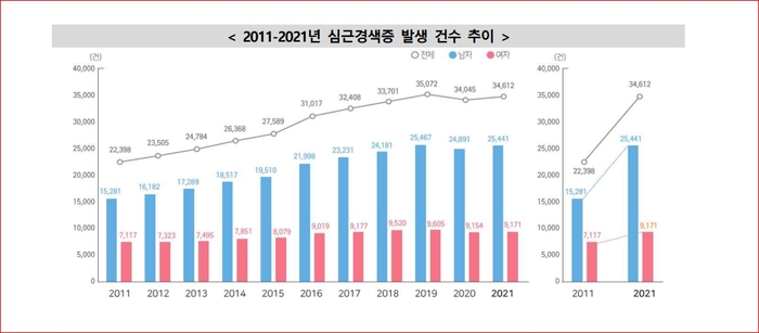 지난 10년간 심근경색증 연령표준화 발생률(건/10만 명당) 추이를 살펴보면, 2011년부터 2019년까지 완만하게 증가하다가 2020년 이후 감소하는 경향을 보였다. 여자는 2011년 22.2건에서 2021년 18.9건으로 감소한 반면 남자는 48.5건에서 57.1건으로 증가했다.