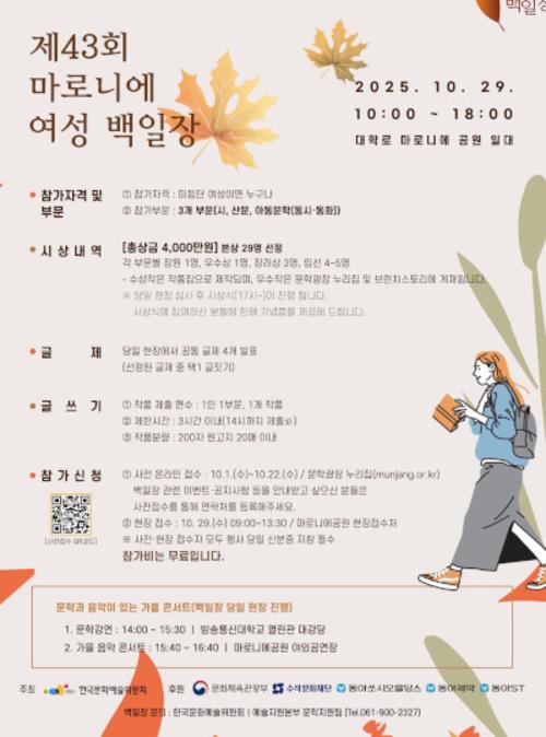 한국문화예술위원회가 주최하고 문화체육관광부, 수석문화재단, 동아쏘시오홀딩스, 동아제약, 동아에스티가 후원하는 마로니에 여성 백일장은 올해로 43회를 맞이했다.