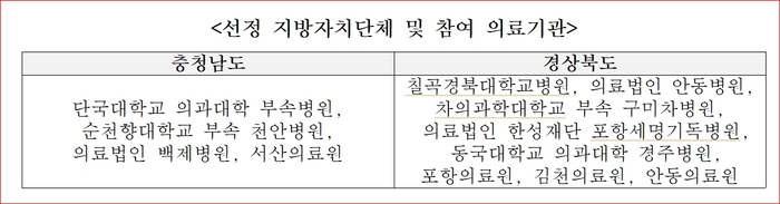 충남에는 단국대학교병원과 순천향대 천안병원, 백제병원, 서산의료원 등이 참여한다. 경북에서는 칠곡경북대병원, 안동병원, 구미차병원, 포항세명기독병원, 동국대 경주병원, 포항·김천·안동의료원 등 다수의 의료기관이 참여할 예정이다.