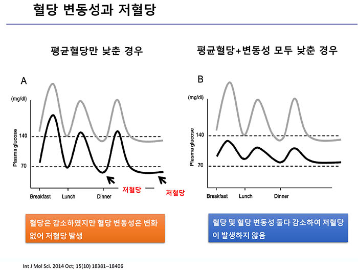 평균 혈당만 조절하면 왼쪽 그래프와 같이 전반적인 혈당이 감소하면서 저혈당이 발생 위험이 따른다. 그러나 평균 혈당뿐만 아니라 혈당 변동성도 조절한다면 저혈당 발생 위험도 없고 환자 만족도도 더욱 높일 수 있을 것이다. 물론 환자의 혈당은 식사와 운동, 스트레스 등 다양한 요인이 영향을 미치기 때문에 이론적으로 생각하는 것만큼 조절하기는 힘들지만 최대한 이상적인 혈당 패턴을 유지할 수 있는 약물을 선택하고 환자를 도와주는 것이 의사의 바램일 것이다.