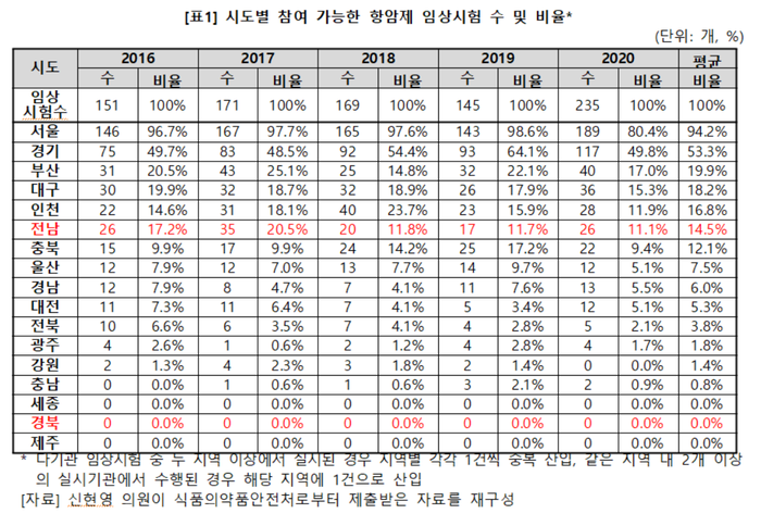 더불어민주당 신현영 의원이 식품의약품안전처로부터 제출받은 자료에 따르면, 최근 5년(2016~2020년)동안 서울에서는 국내에서 수행 중인 항암제 임상시험 중 90% 이상 참여 가능한 것으로 확인됐다. 경기도의 경우에도 53%에 참여가 가능했다.