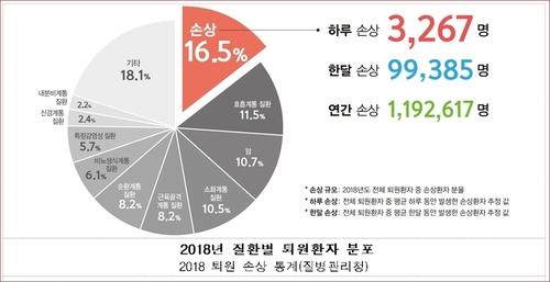전체 입원환자 중 손상환자는 16.5%로, 연간 1,192,617명이 입원하였으며 하루를 기준으로 계산하면 평균 3,267명에 해당하는 수준이었다.
