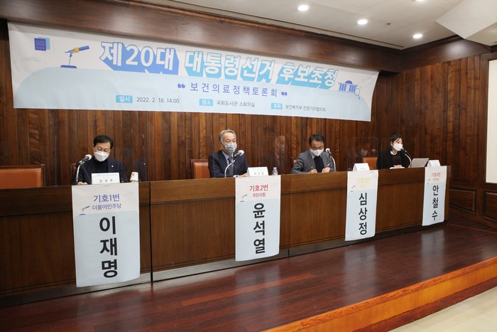 이번 정책토론회는 각 당의 후보를 대변해서 더불어민주당 김성주 의원, 국민의힘 박은철 보건바이오의료분과 위원장, 정의당 고병수 건강정치위원장, 국민의당 윤영희 부대변인이 참석해 각 당의 보건의료공약과 관련한 방향을 설명했다