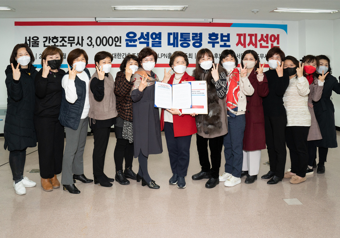 윤석열 후보를 지지하는 서울 간호조무사 모임은 2일 대한간호조무사협회 LPN홀에서 윤석열 후보 지지를 선언했다. 이 자리에서 서울 간호조무사 모임 3천 명은 ‘간호조무사 전문대 양성’, ‘간호조무사협회 법정단체 인정’, ‘간호인력 대통합’ 등 공정과 상식이 통하는 사회를 조성하고 간호조무사 처우개선을 이뤄주길 요청했다.