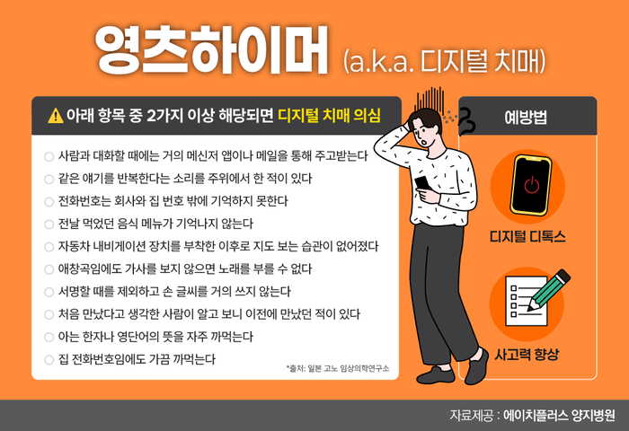 에이치플러스 양지병원 신경과 류창환 전문의는 “디지털 발달로 가족과 친구 연락처나 생일 등 중요한 일정을 뇌가 아닌 스마트폰이 대신 기억해주면서 뇌를 사용하지 않게 돼 치매 같은 현상이 발생한다”라며 “직장, 학교에서 겪는 대인관계나 업무 스트레스 역시 기억력 감퇴를 부르는 요인으로 작용한다”고 전했다.