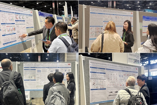▲ 지난 4월 25일부터 30일(현지시각)까지 미국 시카고에서 열린 ‘미국암연구학회(AACR 2025)’에서 한미약품 R&D센터 연구원들이 혁신 항암신약 연구 내용이 담긴 포스터를 토대로 참석자들에게 설명하고 있다.
