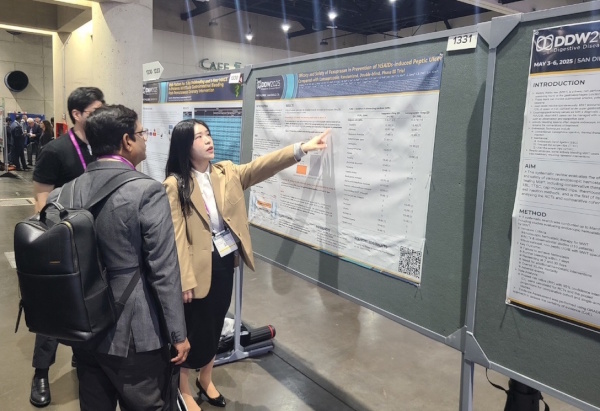 대웅제약(대표 이창재·박성수)은 지난 3일부터 6일까지 미국 샌디에이고에서 열린 세계 최대 규모의 소화기 국제학술대회인 ‘2025 소화기질환 주간(이하 DDW 2025)’에서 펙수클루의 인도환자 대상 위식도역류질환 치료 효과를 평가한 임상 연구 데이터와 NSAIDs(비스테로이드성 소염진통제) 환자 대상 소화성궤양 예방 효능 데이터를 공개했다고 최근 밝혔다.