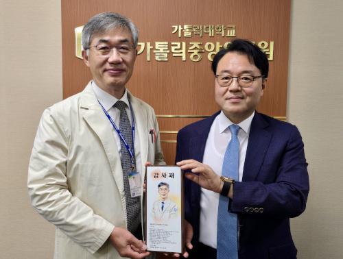 【후생신보】서울시병원회 고도일 회장<右>이 12일 가톨릭 서울성모병원을 방문, 이화성 의무부총장 겸 의료원장과 환담한 후 감사패를 전달했다.