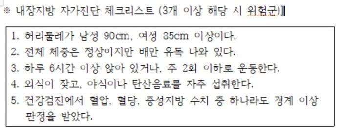 내장지방은 염증성 물질과 특정 호르몬을 분비해 각종 대사질환의 발생 위험을 높이는 데 영향을 미친다. 겉보기에 날씬해 보여도 내장지방이 많은 ‘마른 비만’의 경우도 있어 체중만으로는 위험도를 판단하기 어렵다.