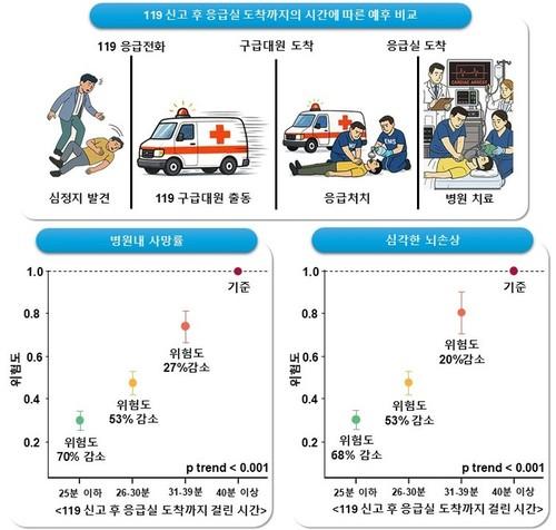 연구팀은 응급실 도착 시간 지연에 따른 누적된 효과도 추가로 확인했다. 응급실 이송이 5분 늘어날 때마다 병원 내 사망률은 약 16%, 심각한 뇌 손상률은 약 14% 증가했다. 이는 현장에서 수행한 목격자 심폐소생술, 자동심장충격기 사용 여부 등 다양한 변수를 보정한 결과로, 응급실 도착까지의 소요 시간이 이들 변수와 무관하게 생존을 결정짓는 독립적 요인임을 보여준다.