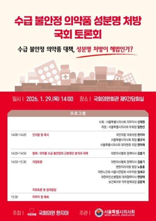 국민의힘 한지아 국회의원이 주최하고 서울특별시의사회가 주관하는 이번 토론회에서는 최근 반복되고 있는 필수·상용 의약품 품절 사태의 구조적 원인을 분석하는 한편, 대안으로 거론되는 성분명 처방의 실효성과 한계를 다각도로 논의한다.