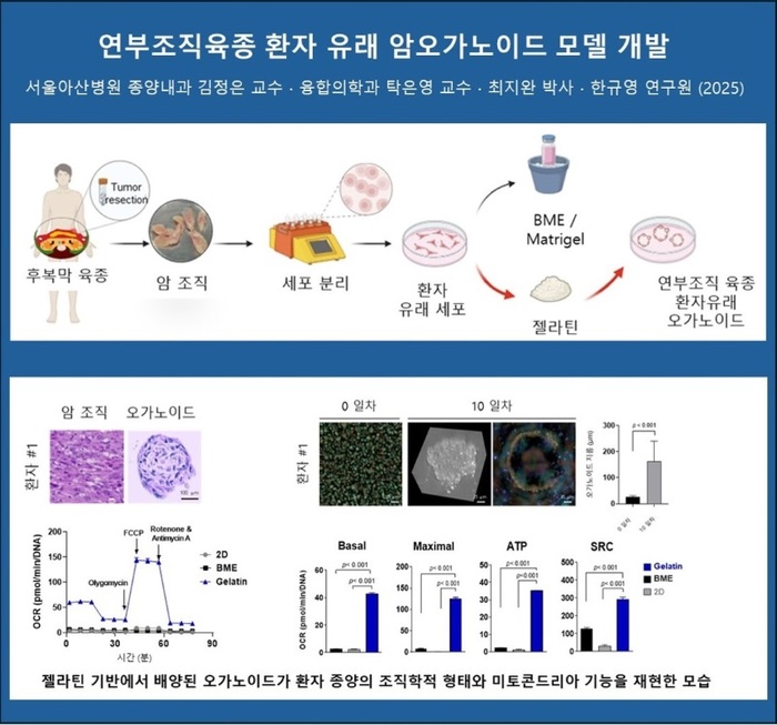 울산의대 서울아산병원 융합의학과 탁은영 교수팀(종양내과 김정은 교수, 융합의학과 최지완 박사·한규영 연구원)은 연부조직육종 환자의 암세포를 젤라틴 기반의 3차원 환경에서 배양함으로써 종양의 특성을 그대로 재현한 오가노이드 모델을 확립했다고 밝혔다.