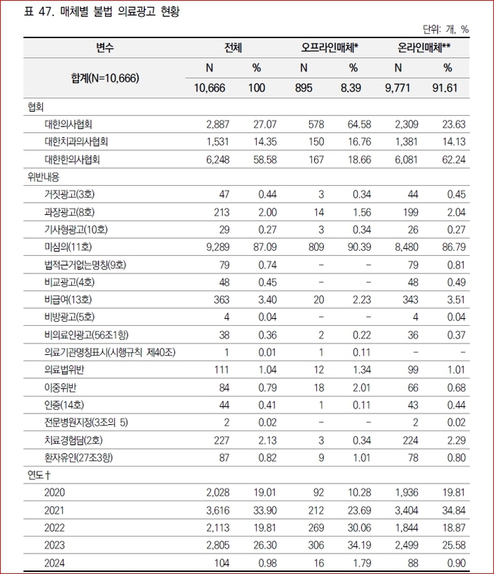 협회별로는 대한치과의사협회가 과장 광고(6.27%)와 치료 경험담 광고(6.53%)의 비율이 높았으며, 대한한의사협회는 비급여 항목 광고(4.37%)와 비의료인광고(0.59%)에서 두드러졌다.
