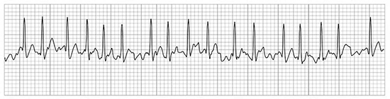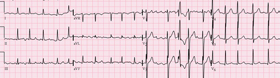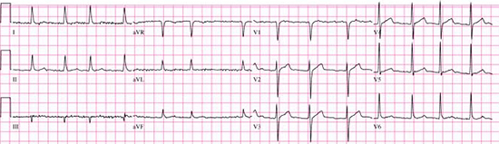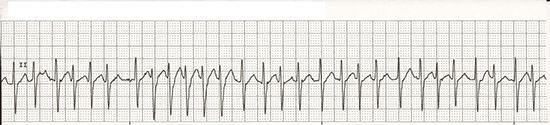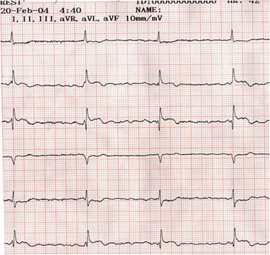 다음의 심전도를 보자. 위로부터 I, II, III, aVR, aVL, aVF의 6유도 심전도가 보인다. 심박수는 분당 30회 정도로 매우 낮고 규칙적이다. 이런 소견은 위의 심방세동과 전혀 다르다. 그러나 QRS앞의 P파를 찾아보면 볼 수 없고 기저선은 지저분하다. 심방세동에 완전 방실차단이 동반한 증례이다.