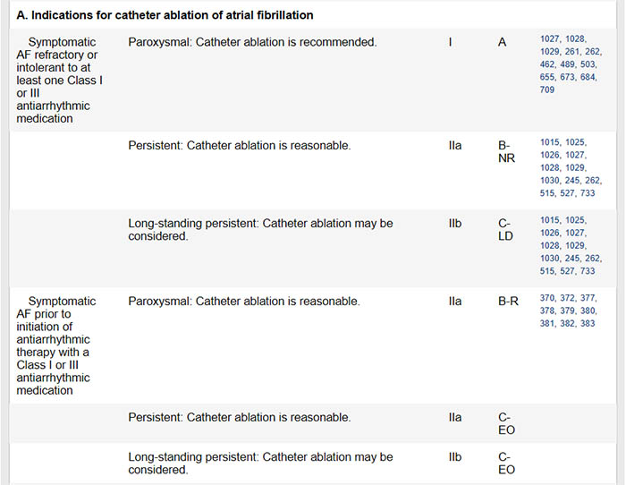심방세동에서 전극도자절제술의 적응증은 아래 도표와 같다. 오른편 I은 꼭 해야 한다는 의미이고 IIa는 하는 것이 좋다는 정도. IIb는 할 수도 있지만 그리 강력한 권고는 아니다. 표에서 보듯이 심방세동에서 전극도자절제술을 꼭 해야 하는 경우(Class I 적응증)는 발작성 심방세동에서 증상이 있고 항부정맥 약물에 반응이 없거나 복용이 어려운 경우이다. 반면에 지속성 심방세동에서 증상이 있고 약물반응이 없는 경우에는 IIa에 속한다. 해볼 만하다는 이야기이다. 반면에 오래가는 지속성 심방세동(1년 이상)에서는 증상이 약에 듣지 않아도 IIb이다. 할 수도 있지만 권고 수준은 극히 낮다.