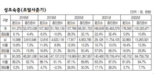 성조숙증 환자도 지난해 17만8,585명이다. 이에 따른 진료비가 무려 1000억원이 넘는 것으로 조사됐다. 2018년 10만1273명에서 2021년 16만8608명으로 껑충 뛰었다. 성조숙증 치료가 부모들 사이에서 키 크는 주사로 소문이 나면서 무분별한 호르몬 치료에 따른 측면도 있다.