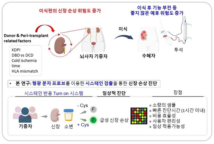 ![]() ▲ [연구 배경 모식도] 시스테인 수치를 감지하는 형광 분자 프로브를 활용한 신장 손상 진단. |