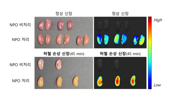 동물 모델 실험에서는 마우스를 이용한 허혈-재관류 손상 모델에서 NPO 프로브를 사용해 정상 쥐와 허혈 손상 쥐의 신장을 비교 분석한 결과, 허혈 손상 쥐의 신장에서 NPO 형광 강도가 정상 쥐보다 훨씬 강하게 나타났다. 이는 NPO를 통해 신장 손상의 심각도를 효과적으로 진단하고 시각화 할 수 있음을 의미한다.