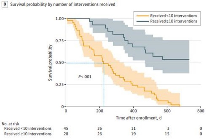 ![]() ▲ EPC 개입 횟수에 따른 생존 확률. 10회 이상의 EPC 개입 받은 환자(회색) 2년 생존율 유의미하게 증가했다. |