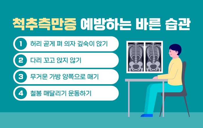 척추측만증은 대부분 잘못된 자세나 습관이 원인이기 때문에 평상시 바른 자세를 유지하고 바른 생활 습관을 길러주는 것이 중요하다. 잘못된 자세 때문에 성장 발달이 저해되면 4~5cm까지도 키 손실을 볼 수 있다. 따라서 평소 허리를 곧게 편 상태로 의자에 깊숙이 앉고 무거운 가방은 양쪽으로 매는 것이 좋으며, 다리를 꼬고 앉는 습관은 교정해야 한다. 근력과 유연성을 강화해 척추 건강을 증진시킬 필요도 있다. 하체는 골반의 높이가 맞도록 잡아주고 상체는 척추가 바르게 될 수 있도록 철봉 매달리기 같은 운동을 해주면 도움이 된다. 철봉에 매달리는 동작은 비대칭으로 수축된 근육을 스트레칭 시켜 양쪽 균형을 맞춰준다.