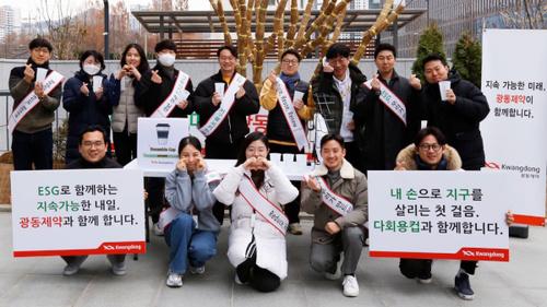 캠페인 참여자들은 본사 출입구에서 ‘지속 가능한 미래, 광동제약이 함께합니다’, ‘내 손으로 지구를 살리는 첫 걸음, 다회용컵과 함께합니다’ 등 구호가 적힌 피켓과 플래카드를 들고 환경보호 알리기에 앞장섰다.