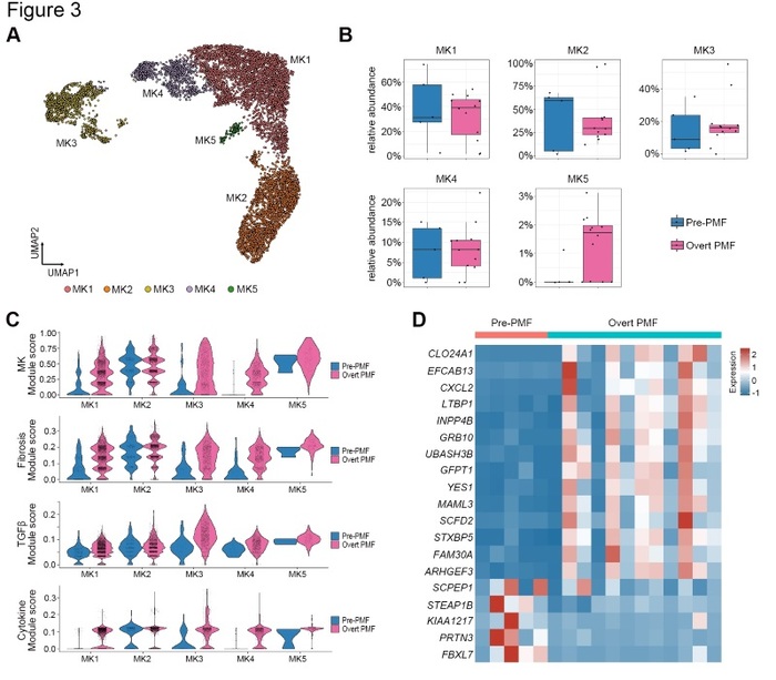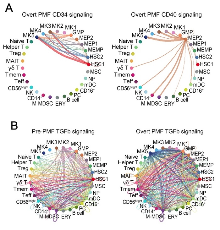 이와함께 환자의 말초혈액에서 아세포(blast) 비율이 1% 이상인 경우, 염증 및 섬유화 유전자가 활성화된 조혈모세포와 거핵세포 하위군이 더 자주 관찰되었다. 이는 혈액검사로도 병의 심각도를 예측할 수 있는 가능성을 보여준다.