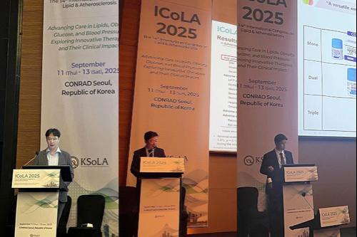 ▲ 지난달 ICoLA2025에서 연자들이 로수젯과 아모프렐을 주제로 발표하고 있다(왼쪽부터 서울의대 강지훈 교수, 연세의대 배성아 교수, 인재의대 고규용 교수).