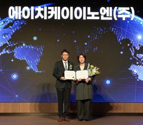 ▲지난 18일, 롯데호텔월드에서 열린 세계일류상품 인증서 수여식에서 산업통상부 최연우 중견기업정책관(사진 왼쪽)과 HK이노엔 R&D 전략실 박현정 상무(사진 오른쪽)가 기념사진을 찍고 있다.