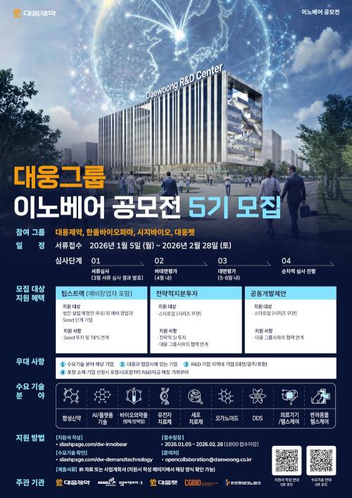 대웅제약(대표 박성수·이창재)은 제약·바이오 및 헬스케어 분야 유망 스타트업 발굴과 동반 성장을 위해 ‘이노베어 공모전’ 5기를 모집한다고 9일 밝혔다. 접수 기간은 2월 28일까지다.