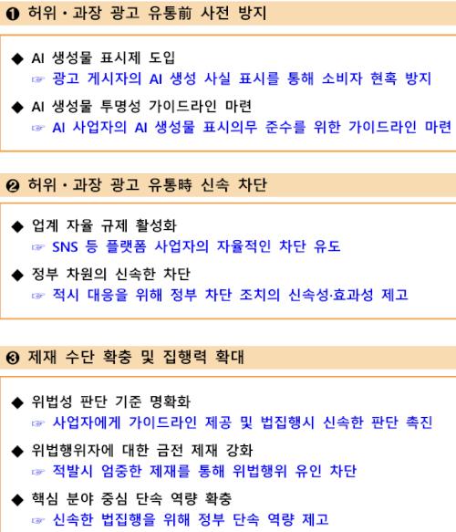 이에 정부는 신속 차단에 방점을 찍고 ▲AI 허위·과장 광고 유통前 사전 방지 ▲AI 허위·과장 광고 유통時 신속한 차단 ▲위법행위자에 대한 금전제재 강화 및 단속역량 확충에 적극 나서겠다는 방침이다.