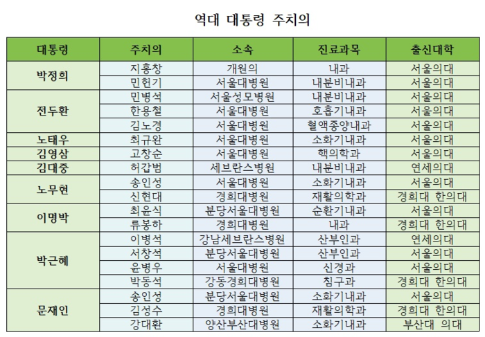 지금까지 대통령 주치의 중 서울의대 출신은 12명, 연세의대 2명이 임명됐다. 또한 대통령 주치의 15명 중 15명의 11명이 내과였다.