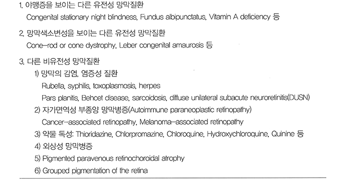 참고문헌 유전성망막질환, 유형곤 망막, 4th edition, 한국망막학회 임상시각전기생리학 개정판, 한국임상시각전기생리학회