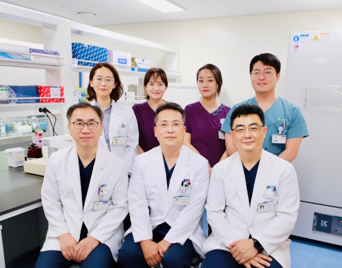 ▲ (위줄 좌측부터 시계방향으로) 윤진아 교수, 김지연 간호사, 김보라 간호사, 최성혁 임상병리사, 김찬규 교수, 김세형 교수, 박성규 교수.