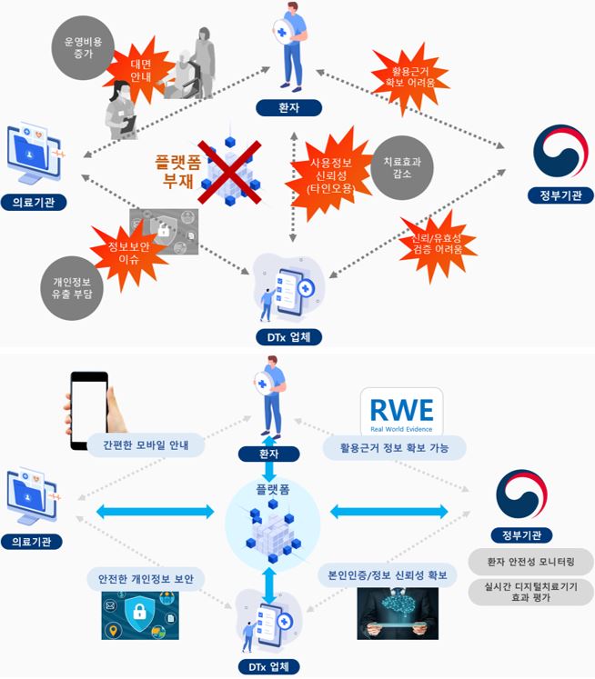 건강보험공단이나 식품의약품안전처 등 정부기관은 처방되는 디지털 치료기기가 임상시험 결과와 마찬가지로 치료효과가 유효한지 실시간으로 모니터링 할 수 있다. 특히 디지털 치료기기 개발사는 모든 의료기관과 개별적으로 접촉할 필요 없이 플랫폼에 속해있는 의료기관들과 쉽게 연결이 가능하다. 서울성모병원과 보라매병원, 원주세브란스기독병원, 고려대안암병원, 분당서울대병원 등이 플랫폼 개발에 참여해 도입을 앞두고 있다.