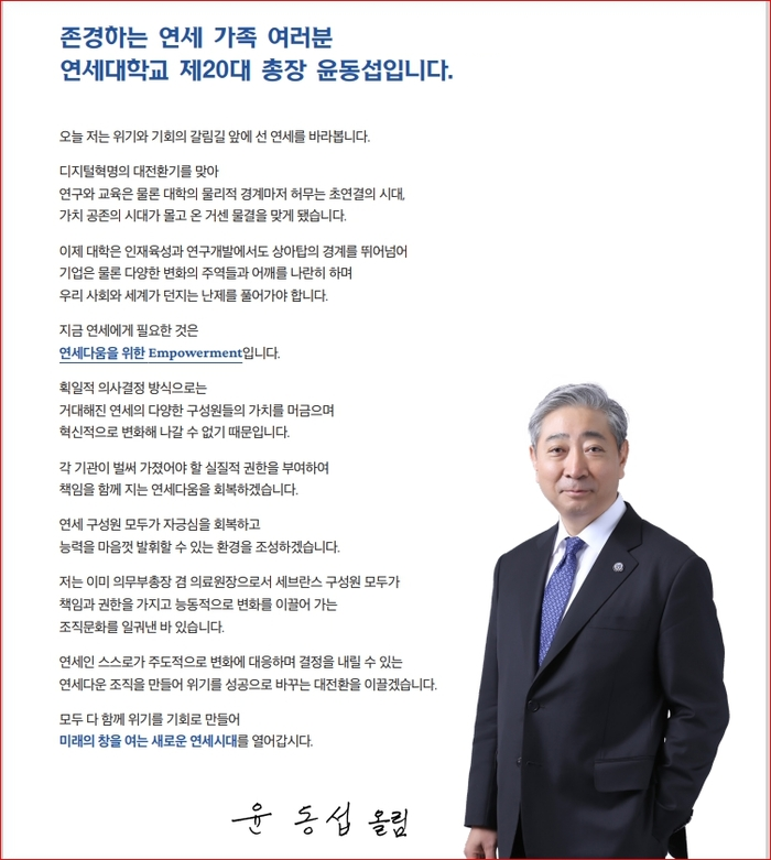 윤동섭 연세대 총장 “미래의 창을 여는 새로운 연세시대” 다짐1일 취임식 개최 연세인의 자긍심 회복을 통한 시대 변화를 선도【후생신보】 ‘미래의 창을 여는 새로운 연세시대’를 구축 연세 구성원 모두가 자긍심을 회복하고 능력을 마음껏 발휘할 수 있는 환경을 조성할 방침입니다.