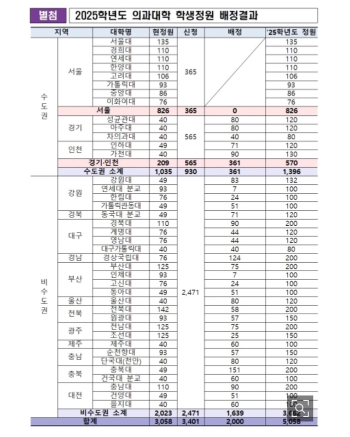 ’25학년도 정원 배정은 지역완결형 의료체계 구축을 위하여 비수도권에 80% 이상 정원을 배정하였고,수도권에 배정된 정원은 서울과 경인 간 큰 편차를 해소하기 위해 경인지역에 전원 배정하였습니다.