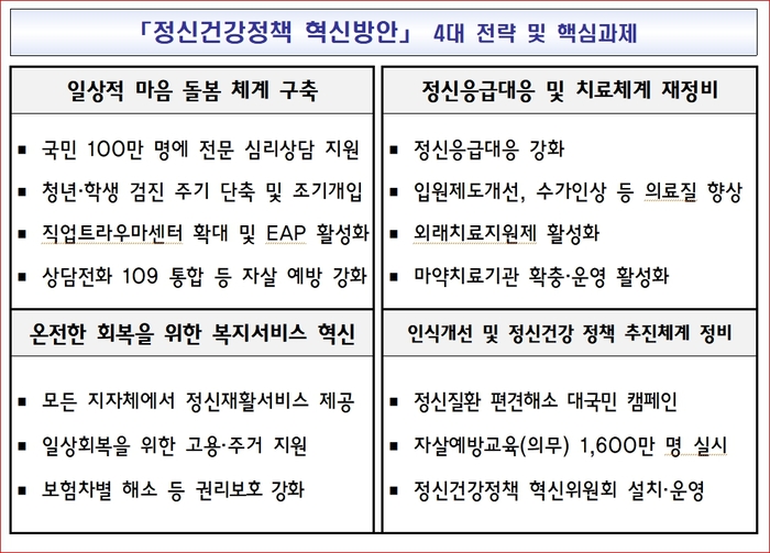 정부는 자살 예방을 위해 지난 1월부터 통합 상담번호 109를 운영 중이다. SNS 상담을 도입하고 상담 인력을 확충할 계획이다. 정신 응급상황에 신속 대응할 수 있는 체계를 구축할 예정이다. 지역 위기개입팀 인력을 102명 확대 배치한다. 2028년까지 권역 정신응급의료센터를 32개소까지 늘릴 계획이다.