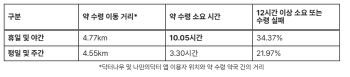 또한 12시간 이상 소요 또는 수령 실패 비율이 평일 및 주간은 21.97%, 휴일 및 야간은 34.37%에 달하고 있다. 특히 야간(18시~익일 08시) 시간 약 수령률이 33.24%에 불과해 야간시간 약 수령이 저조한 것으로 확인됐다.