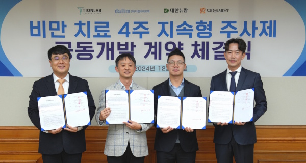 【후생신보】대웅제약(대표 박성수·이창재)은 티온랩 테라퓨틱스(대표 임덕수), 대한뉴팜(대표 이원석), 다림바이오텍(대표 정종섭)과 ‘비만 치료 4주 지속형 주사제’ 공동 개발을 위한 계약을 체결했다고 12일 밝혔다.