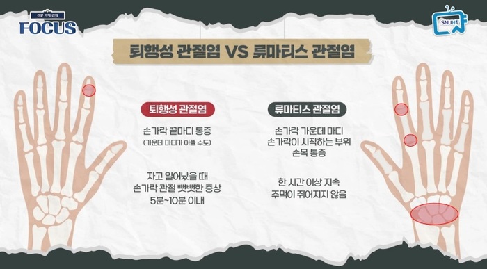 반면 자가면역반응으로 인해 발생한 류마티스 관절염은 손가락 가운데 마디와 시작 부위, 손목에서 통증이 발생하고 기상 후 류마티스 관절염은 주먹을 쥐지 못할 정도의 경직이 1시간 이상 지속되는 반면, 퇴행성관절염은 손가락 관절의 뻣뻣함이 5~10분 이내로 지속된다.