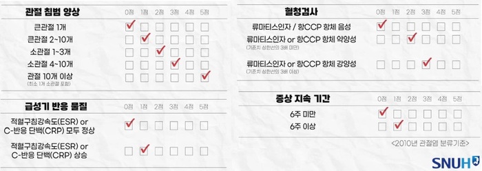 류마티스 관절염은 ▲관절 침범 양상 ▲혈액 검사 ▲급성기 반응 물질 검사 ▲증상 지속기간 4가지 항목의 총점을 합산해 6점 이상일 때 진단한다.
