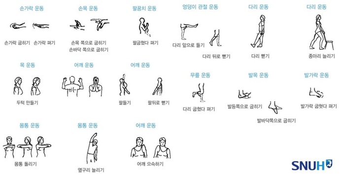 염증이 가라앉으면 운동을 권장한다. 관절의 운동범위를 완전히 굽혔다 펴는 동작을 하루에 3~4회 이상하는 것이 중요하며, 염증과 통증이 개선된 후에는 가벼운 걷기, 수영, 아쿠아로빅, 자전거, 스트레칭을 권장한다. 관절에 큰 충격을 주는 격한 운동이나, 쪼그리고 앉는 자세는 피하는 것이 좋다.