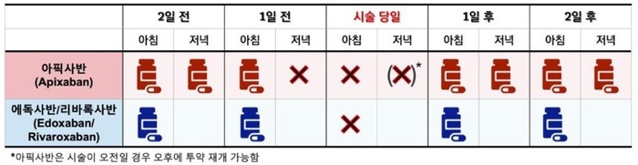 ![]() ▲ ‘PERIXa’ 프로토콜에 따른 항응고제 중단 및 재개 방법 = 하루 한 번 복용하는 항응고제(에독사반/리바록사반)는 시술 당일 아침 복용을 건너뛰고, 시술 다음 날 아침부터 복용을 재개. 하루 두 번 복용하는 항응고제(아픽사반)는 시술 전날 저녁과 시술 당일 아침 복용을 중단하고 지혈 상태를 확인한 뒤 복용을 재개. |