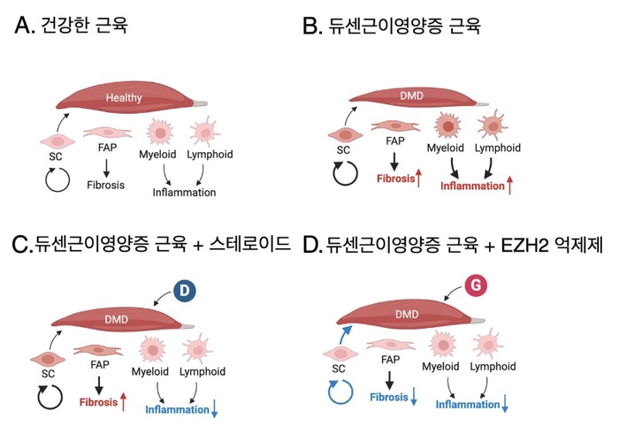분석 결과, 듀센근이영양증 환자 및 동물 모델에서 EZH2 유전자의 과활성화가 근육 섬유화 및 염증 반응과 직접적으로 연관됨을 확인했다.