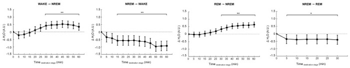 ![]() ▲ 무선 근적외선 분광기로 5분마다 측정한 뇌 수분량 변화 = 비렘수면, 특히 깊은 수면 단계로 진입할수록 뇌 수분량이 뚜렷하게 증가하며, 아교임파계에 의한 뇌 세척 활동이 활발해지고, 반대로 렘수면이나 각성 상태에서는 뇌 수분량이 감소해 청소 기능이 저하되는 모습. |