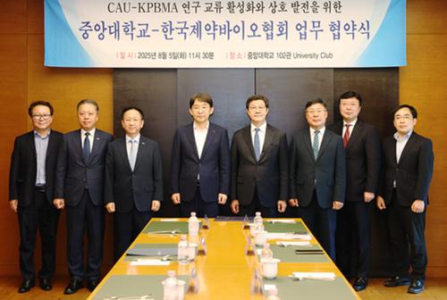 【후생신보】중앙대학교(총장 박상규)와 한국제약바이오협회(회장 노연홍)이 지난 5일 오전 11시 30분 중앙대 서울캠퍼스 102관 University Club에서 업무협약을 체결했다.
