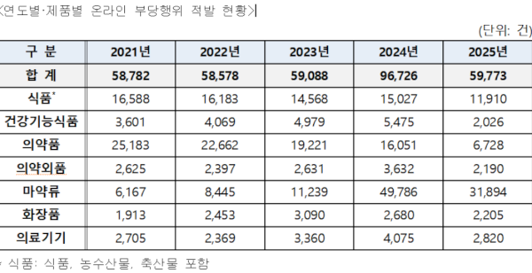 사이버조사팀에 따르면 2024년 온라인 부당행위 적발 건수는 9만 6,726건에 달했다. 이는 전년대비 63% 늘어난 수치다. 2023년 5,9088건과 비교해 보면 적지 않은 증가세다. 이 같은 증가세는 마약류 불법 유통 등에 대한 사회적 지대한 관심이 반영된 결과다.