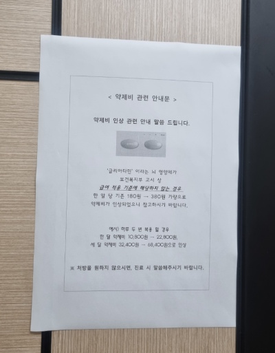 실제 서울 시내 한 종합병원에는 글리아타민의 1정 당 180원에서 380원 가량으로 약제비가 인상됐다는 안내문이 붙여졌다. 해당 안내문에는 하루 1정 복용 시 1개월, 3개월 예사 약제비가 예시로 기재되어 있다.