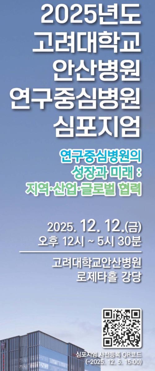 【후생신보】고려대학교 안산병원(서동훈 병원장)은 오는 12일 오후 12시, 별관 지하 1층 로제타홀 강당에서 ‘연구중심병원의 성장과 미래 : 지역·산업·글로벌 협력’을 주제로 심포지엄을 개최한다.
