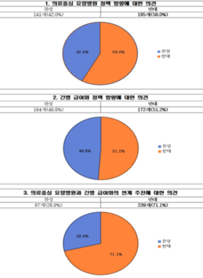 협회가 최근 진행한 설문조사<아래 사진>에서도 의료중심 요양병원과 간병급여화 연계에 대한 반대 의견이 찬성보다 높게 나타났다. 현장의 목소리는 명확하다. 정책의 출발점이 잘못됐다는 것이다.